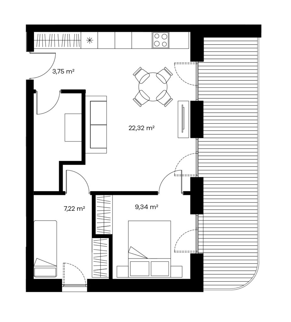 Trijų kambarių butai labai tiks žmonėms, norintiems šiek tiek didesnės erdvės. Tokio išplanavimo bute rasite sujungtą virtuvės, valgomojo ir svetainės zoną, visiškai atskirą miegamąjį, vonios kambarį ir papildomą kambarį, kurį galėsite išnaudoti kaip darbo kambarį arba kaip atskirą vaikų kambarį arba priimti komfortiškai pailsėti draugų šeimą.