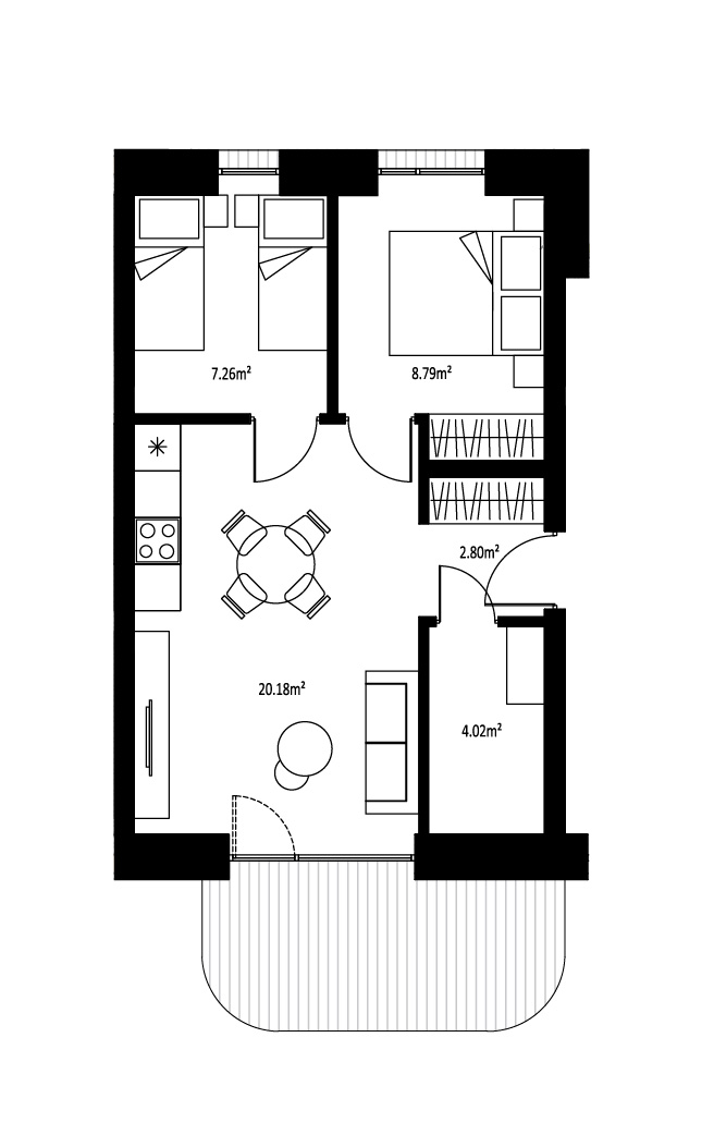 Trijų kambarių butai labai tiks žmonėms, norintiems šiek tiek didesnės erdvės. Tokio išplanavimo bute rasite sujungtą virtuvės, valgomojo ir svetainės zoną, visiškai atskirą miegamąjį, vonios kambarį ir papildomą kambarį, kurį galėsite išnaudoti kaip darbo kambarį arba kaip atskirą vaikų kambarį arba priimti komfortiškai pailsėti draugų šeimą.