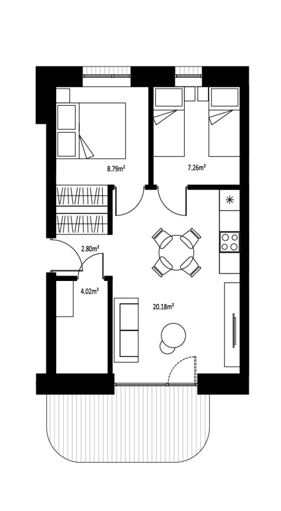 Trijų kambarių butai labai tiks žmonėms, norintiems šiek tiek didesnės erdvės. Tokio išplanavimo bute rasite sujungtą virtuvės, valgomojo ir svetainės zoną, visiškai atskirą miegamąjį, vonios kambarį ir papildomą kambarį, kurį galėsite išnaudoti kaip darbo kambarį arba kaip atskirą vaikų kambarį arba priimti komfortiškai pailsėti draugų šeimą.