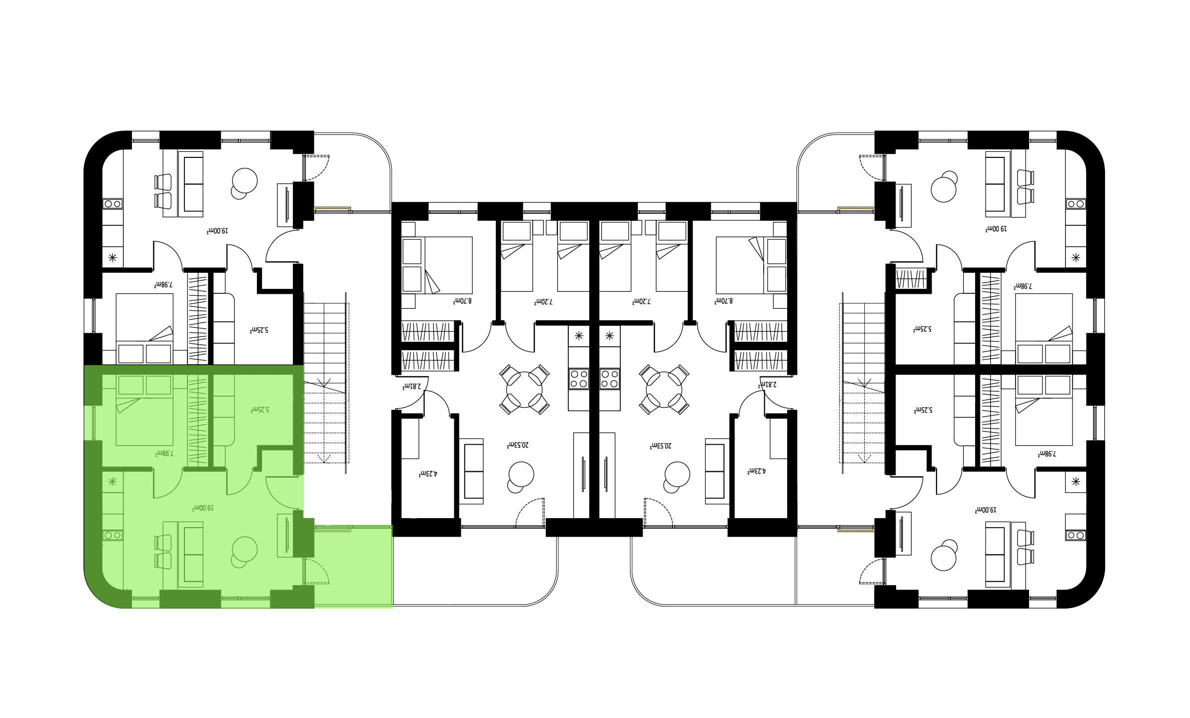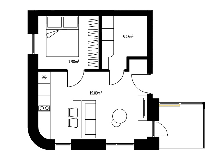 Dviejų kambarių butai pritaikyti patogiai poilsiauti vienam asmeniui ar porai. Tokio išplanavimo bute rasite sujungtą virtuvės, valgomojo ir svetainės zoną, pilnai atskirą miegamąjį, vonios kambarį.