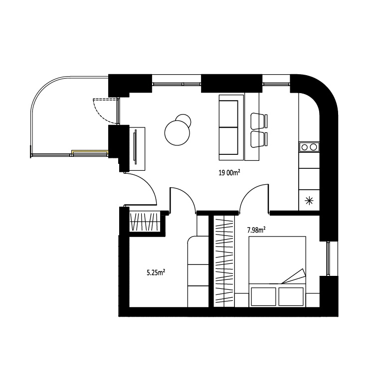 Dviejų kambarių butai pritaikyti patogiai poilsiauti vienam asmeniui ar porai. Tokio išplanavimo bute rasite sujungtą virtuvės, valgomojo ir svetainės zoną, pilnai atskirą miegamąjį, vonios kambarį.