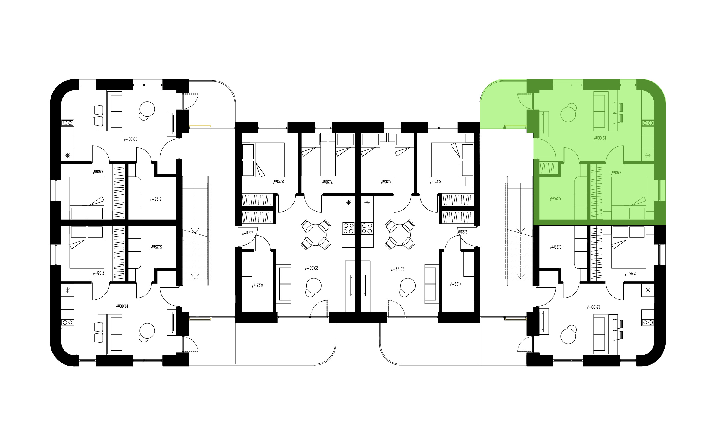 Dviejų kambarių butai pritaikyti patogiai poilsiauti vienam asmeniui ar porai. Tokio išplanavimo bute rasite sujungtą virtuvės, valgomojo ir svetainės zoną, pilnai atskirą miegamąjį, vonios kambarį.