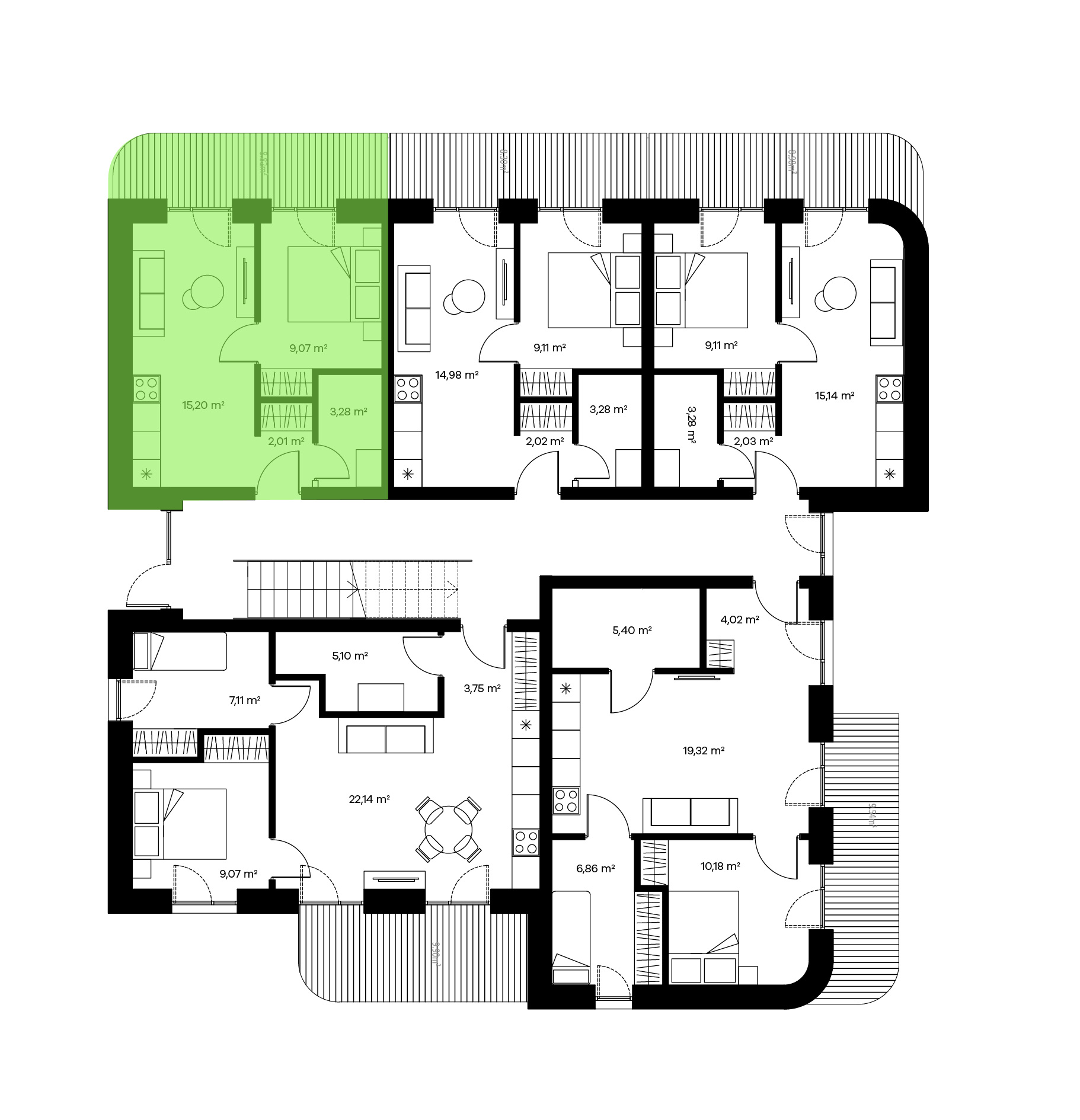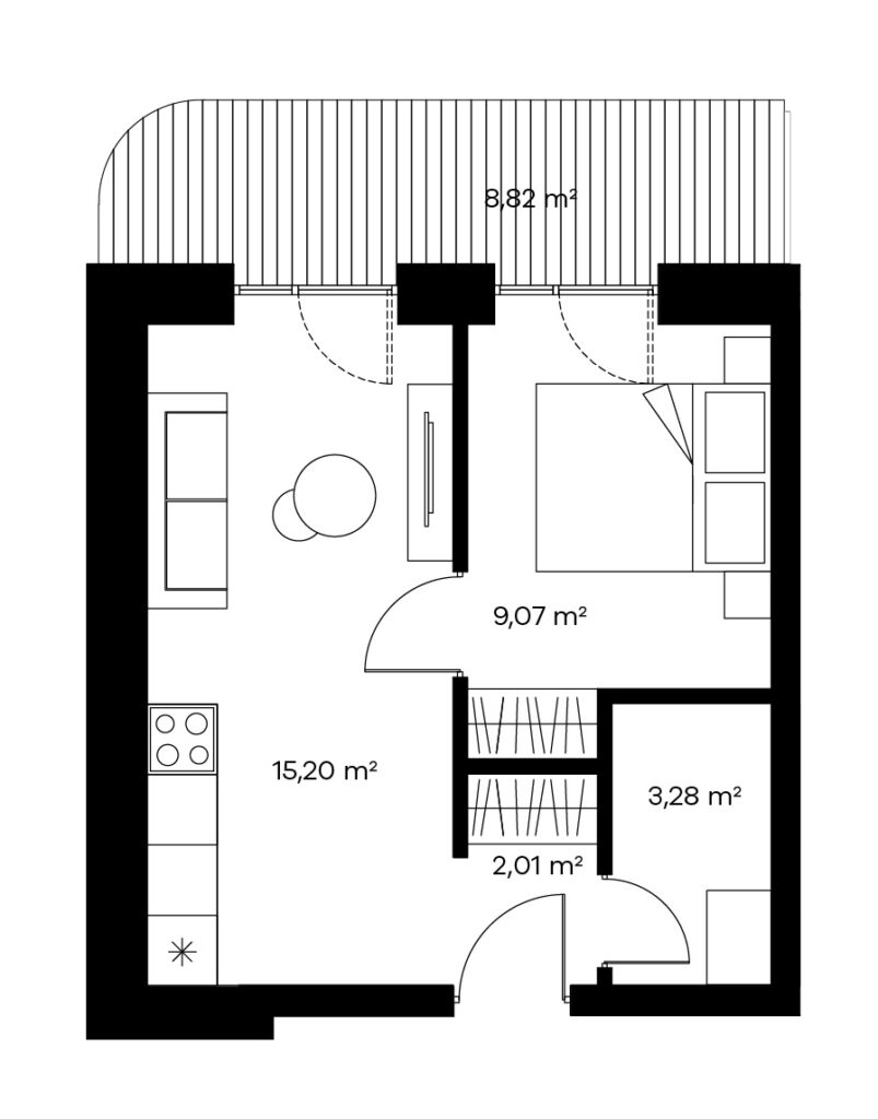 Dviejų kambarių butai pritaikyti patogiai poilsiauti vienam asmeniui ar porai. Tokio išplanavimo bute rasite sujungtą virtuvės, valgomojo ir svetainės zoną, pilnai atskirą miegamąjį, vonios kambarį.