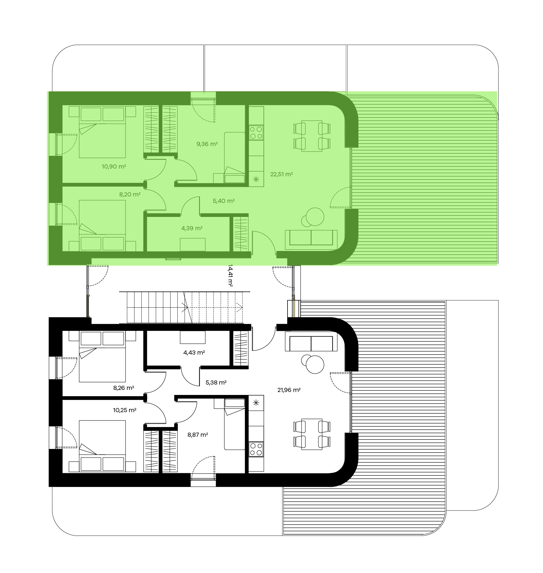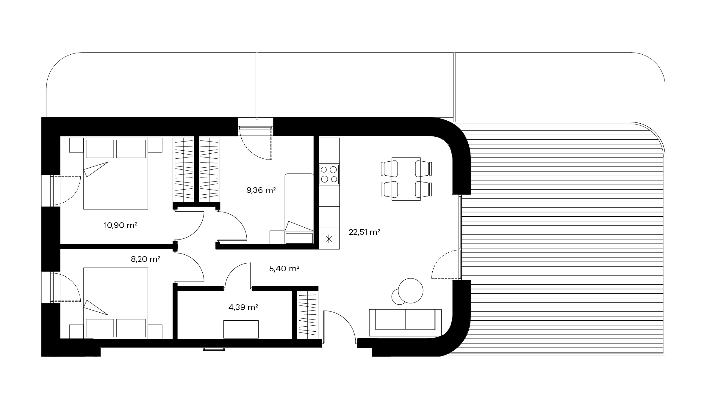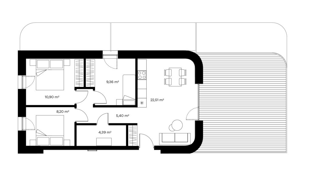 Keturių kambarių butai puikai pritaikyti žmonėms, mėgstantiems didesnes erdves ar turintiems didesnę šeimą. Tokio išplanavimo bute rasite sujungtą virtuvės, valgomojo ir svetainės zoną, visiškai atskirą miegamąjį, vonios kambarį, balkoną ir net 2 papildomus kambarius, kuriuos galėsite panaudoti kaip vaikų, darbo ar pasikviesti pasisvečiavimui didesnę draugų kompaniją.
