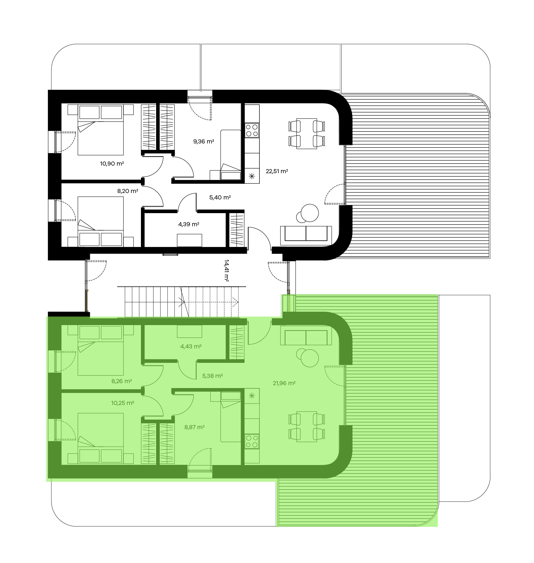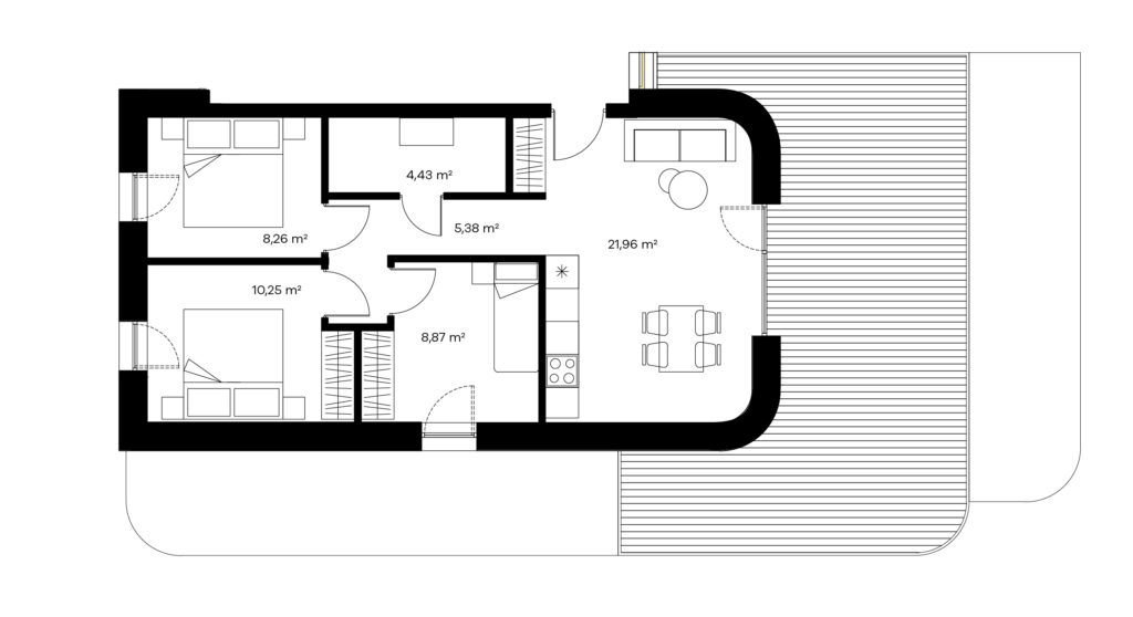 Keturių kambarių butai puikai pritaikyti žmonėms, mėgstantiems didesnes erdves ar turintiems didesnę šeimą. Tokio išplanavimo bute rasite sujungtą virtuvės, valgomojo ir svetainės zoną, visiškai atskirą miegamąjį, vonios kambarį, balkoną ir net 2 papildomus kambarius, kuriuos galėsite panaudoti kaip vaikų, darbo ar pasikviesti pasisvečiavimui didesnę draugų kompaniją.